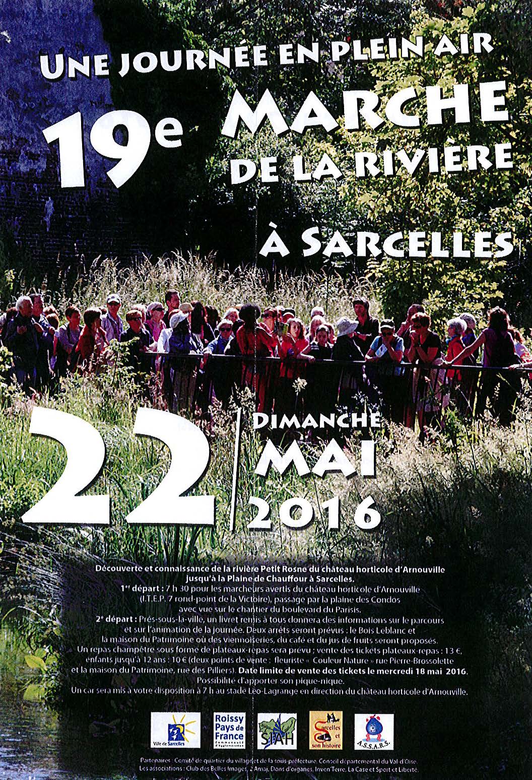 Les amoureux de la marche et du Petit Rosne vont se retrouver le dimanche 22 mai 2016 pour une sympathique randonnée le long de ce cours d’eau. Le Petit Rosne appartient à l’histoire de Sarcelles à travers l’ensemble des usages passés (moulins, lavoirs, etc.) mais également de par ses caprices impétueux se traduisant par de nombreuses inondations. La dernière à avoir laisser sa trace dans les mémoires est survenue en 1992. Le choc qu’elle a produit parmi les habitants a conduit à la création de l’ASSARS (l’Association Sarcelloise pour la Sauvegarde et l’Aménagement des Rivières et des Sites), association influente et dynamique.