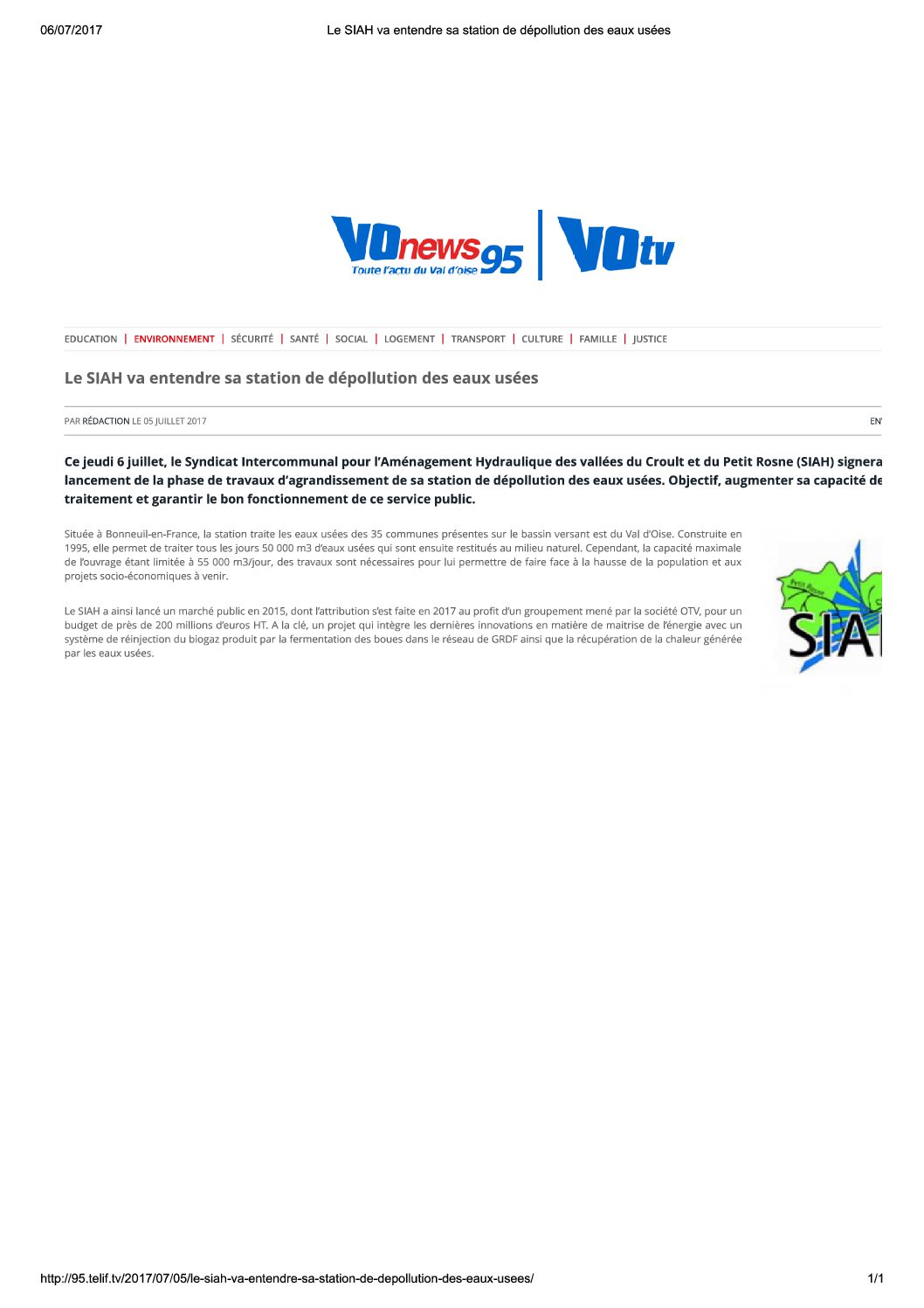 Ce jeudi 6 juillet, le Syndicat Intercommunal pour l’Aménagement Hydraulique des vallées du Croult et du Petit Rosne (SIAH) signera le lancement de la phase de travaux d’agrandissement de sa station de dépollution des eaux usées….