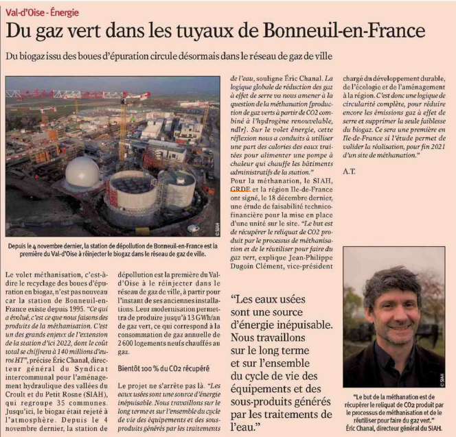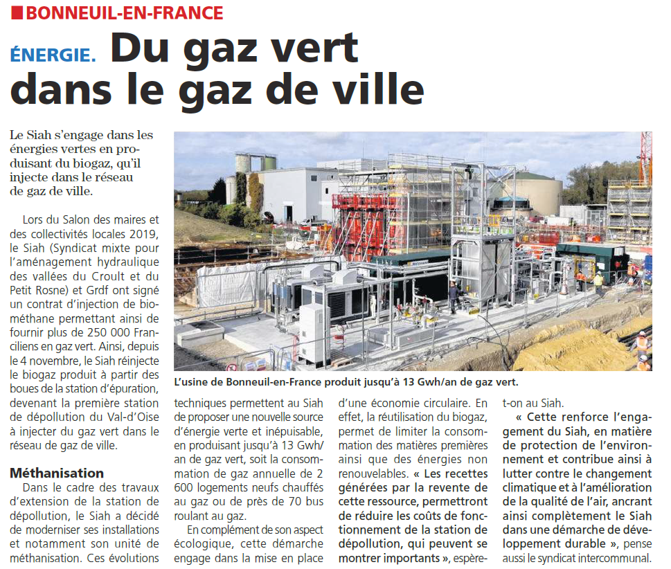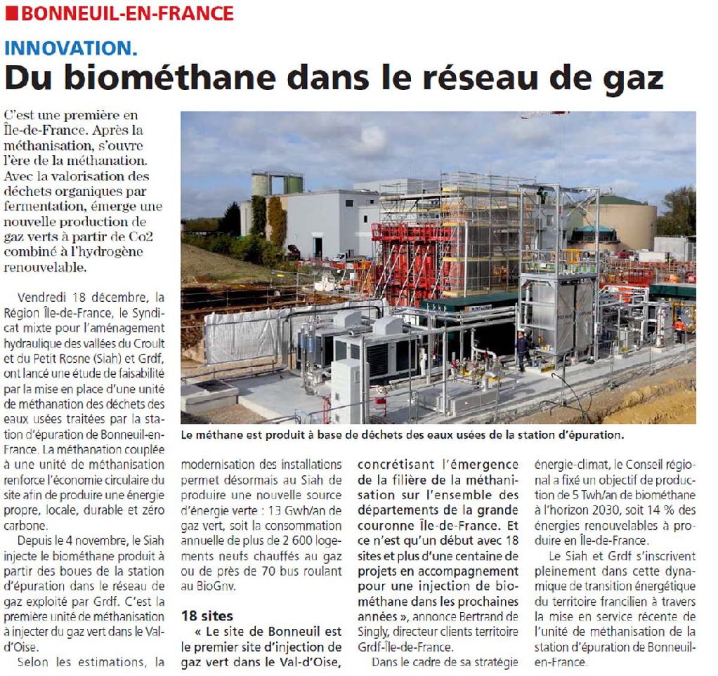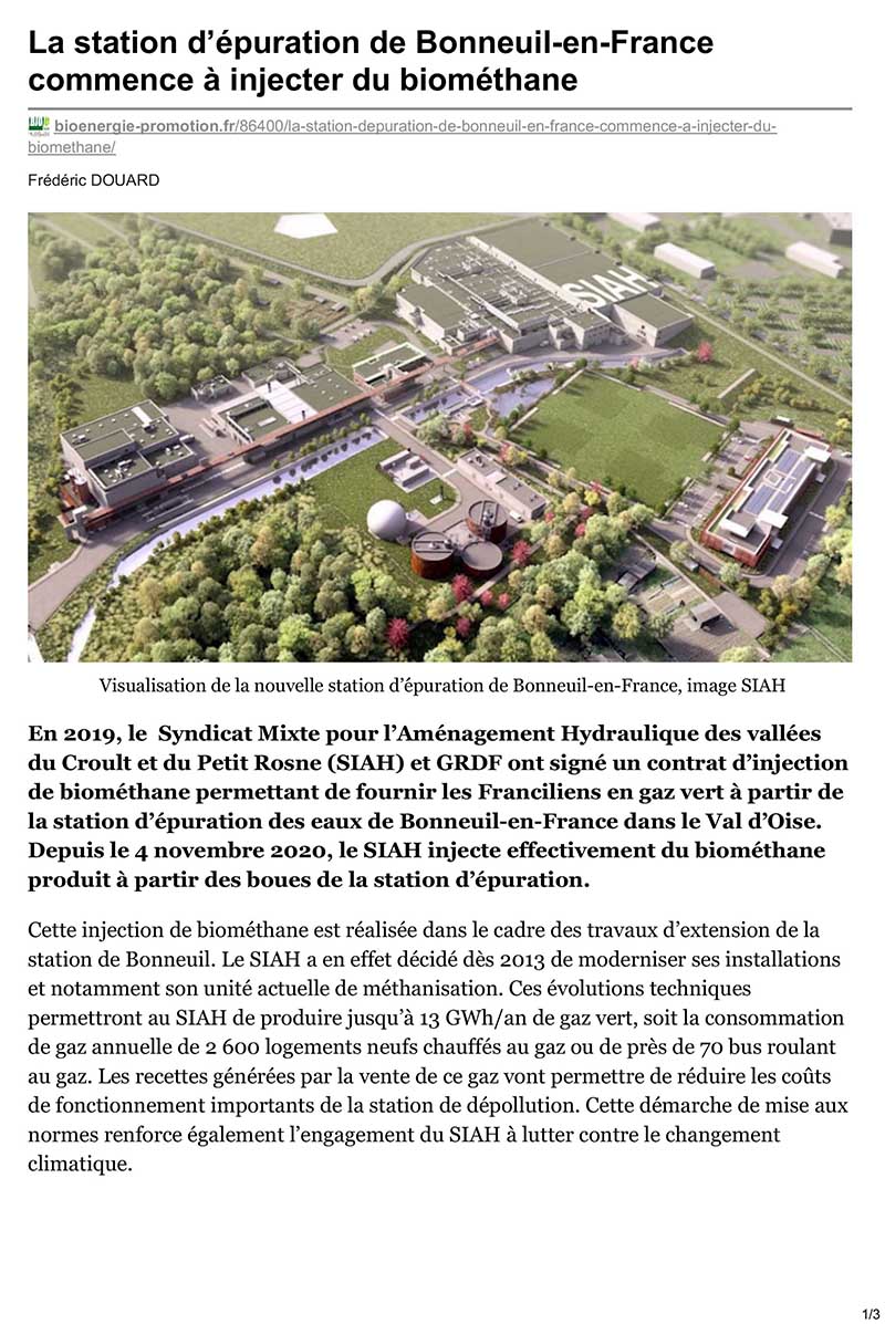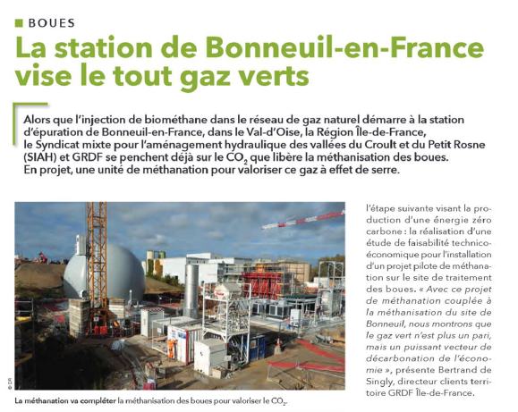 En 2019, le Syndicat Mixte pour l’Aménagement Hydraulique des vallées du Croult et du Petit Rosne (SIAH) et GRDF ont signé un contrat d’injection de biométhane permettant de fournir les Franciliens en gaz vert à partir de la station d’épuration des eaux de Bonneuil-en-France dans le Val d’Oise.