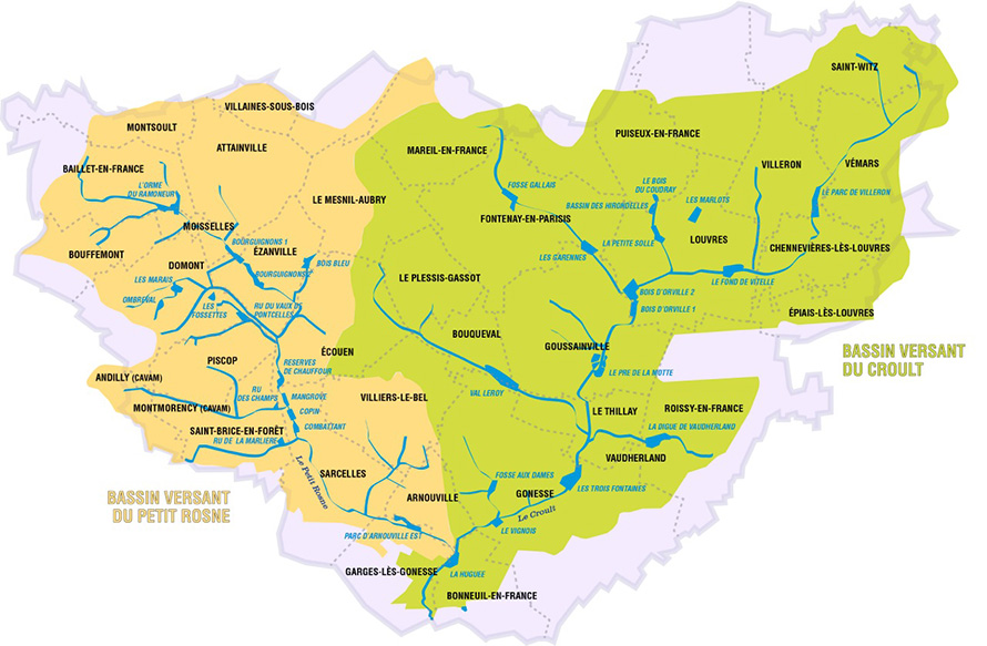 Les bassins de retenue (ou bassin de rétention) des eaux pluviales sont des cuvettes aménagées servant de zone tampon en cas de forte intempérie. Ces ouvrages hydrauliques à ciel ouvert sont disposés de façon stratégique sur les vallées du Croult et du Petit Rosne. La plupart d’entre eux ont une apparence champêtre  et sont considérés comme de petites  réserves de biodiversité.