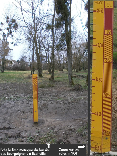 Depuis 2012, c’est un dispositif d’un tout autre ordre que le SIAH a commencé à mettre en place sur ses bassins : des échelles limnimétriques. Sous ce nom complexe se cache en fait un objet très simple, une sorte de règle géante permettant de mesurer les hauteurs d’eau dans un bassin ou un cours d’eau (voir illustration). Après le bassin des Trois fontaines à Gonesse, ce sont les bassins d’Arnouville Est à Garges-lès-Gonesse et le bassin des Bourguignons à Ezanville qui viennent d’être équipés. Ces échelles (ou mires) graduées en mNGF (unités de mesures de l’élévation par rapport au niveau de la mer) sont installées généralement à proximité du déversoir de sécurité des bassins. Elles permettent aux agents du SIAH et notamment à ceux chargés de la gestion des eaux pluviales, de connaître précisément le niveau d’eau dans le bassin de manière à ce que l’astreinte hydraulique puisse bénéficier d’une lecture de terrain facilitant ainsi l’aide à la décision en temps de crise. L’implantation d’échelles limnimétriques se poursuivra encore cette année.